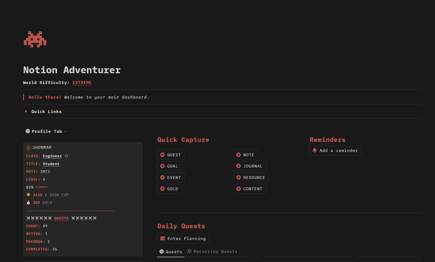 A gamified Notion workspace with an EXP-leveling system. Complete your tasks as if they were quests!Walkthrough Video: https://shorturl.at/eGIKP *Updates within the template are included after purchase.